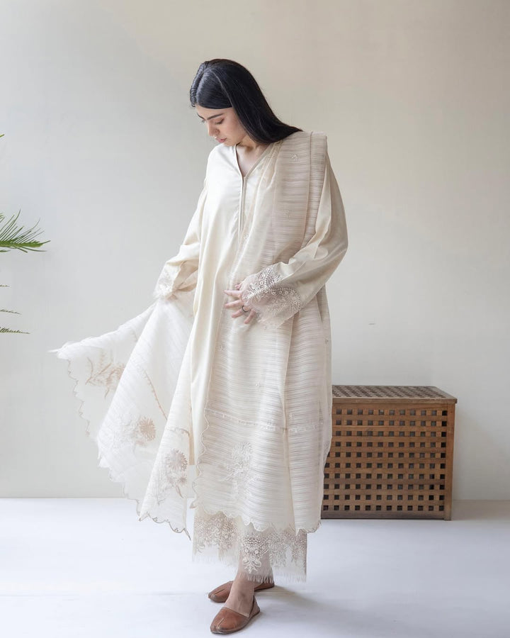 Three-piece luxury set featuring delicate embroidery on shirt, dupatta & trouser made for moments that deserve grace.