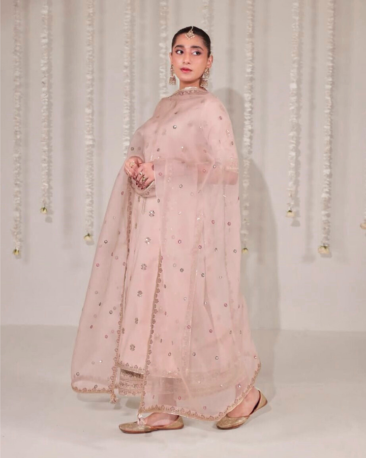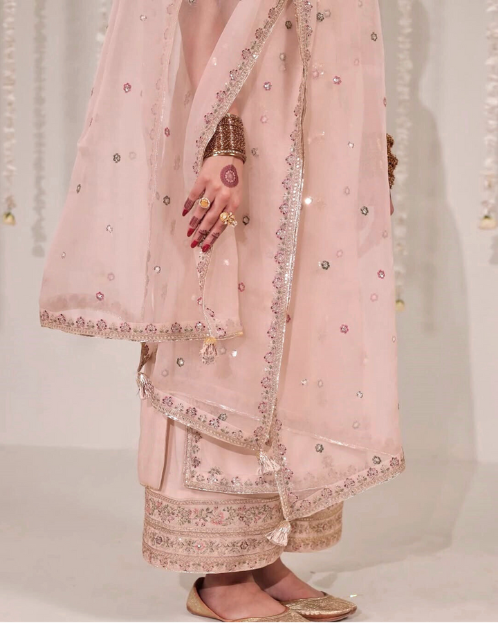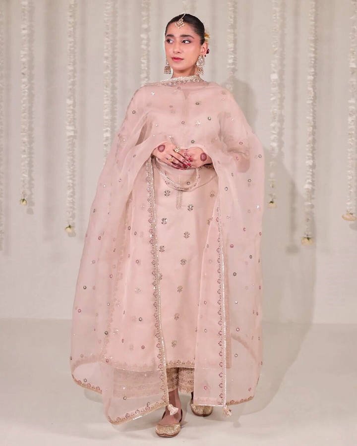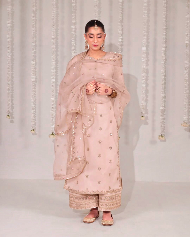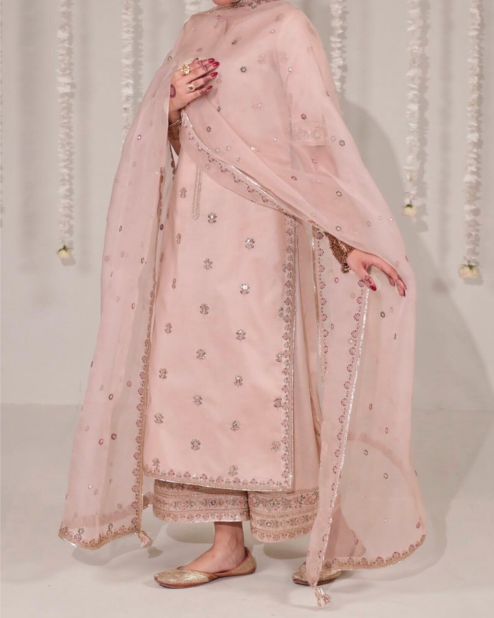 Three-piece luxury set featuring delicate embroidery on shirt, dupatta & trouser made for moments that deserve grace.